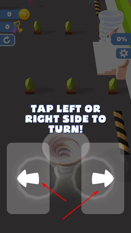 1、点击屏幕左右两侧箭头按钮,控制龙卷风左右转向,在道路场景中移动。