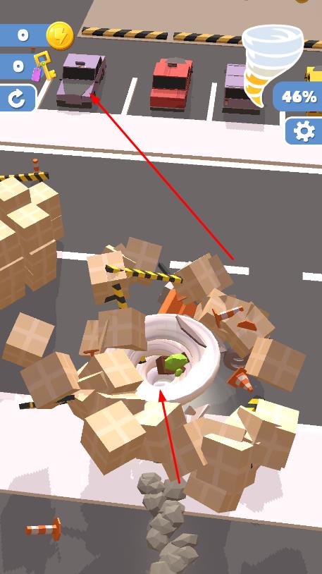2、利用龙卷风吞噬沿途物品,箱子、汽车等,提升吞噬进度,如46%,收集金币、道具。