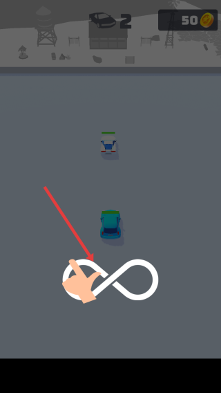 1、滑动屏幕按∞轨迹,操控蓝色汽车漂移,靠近白色车辆完成互动如追逐、对抗。