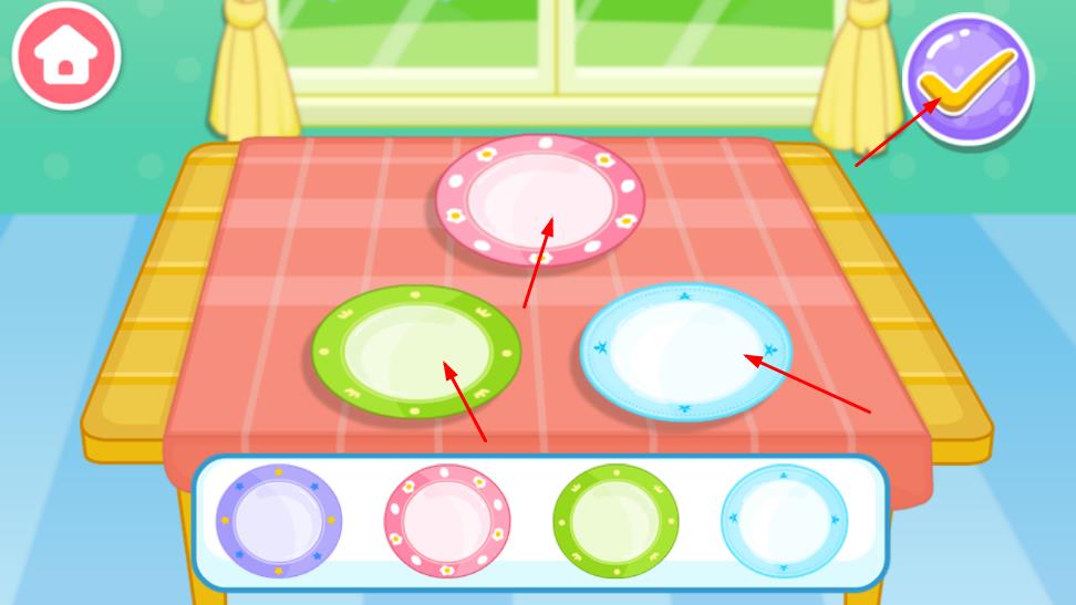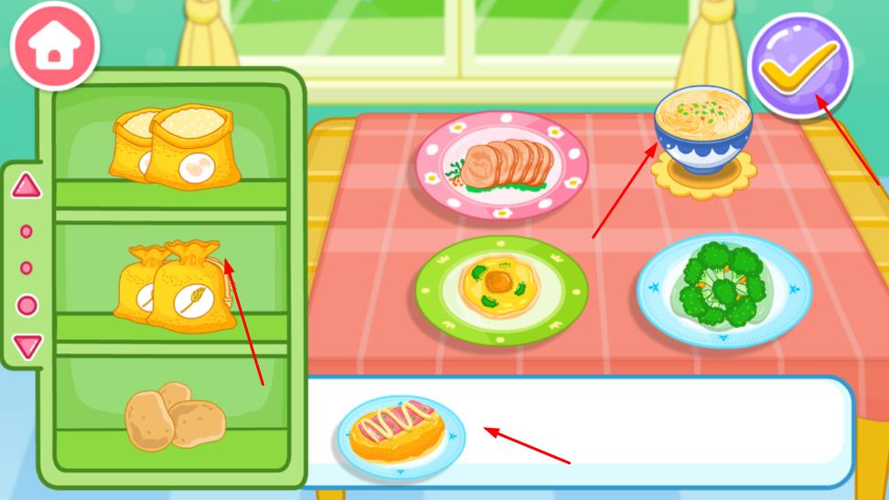 2、从食材库选取食材,放置餐桌对应餐盘,组合餐食,点击右上角的√确认搭配。