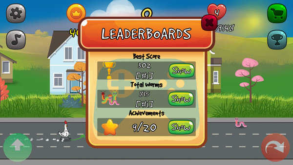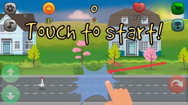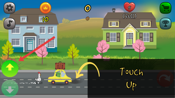 2、在游戏中出现车辆等元素时,通过点击左侧绿色向上箭头按钮,操控移动,注意避让小鸡,推进关卡。