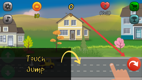 3、在正前方如果来不及躲避,点击右侧红色旋转箭头按钮,操控小鸡跳跃车辆,随后完成小镇场景的冒险任务。
