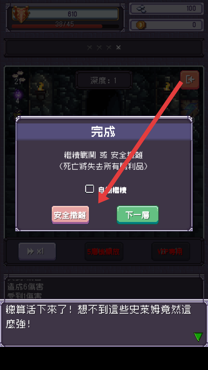 2、关卡结束后,若想保留战利品可选择安全撤離,想继续挑战则点击下一層,需注意死亡会丢失战利品。