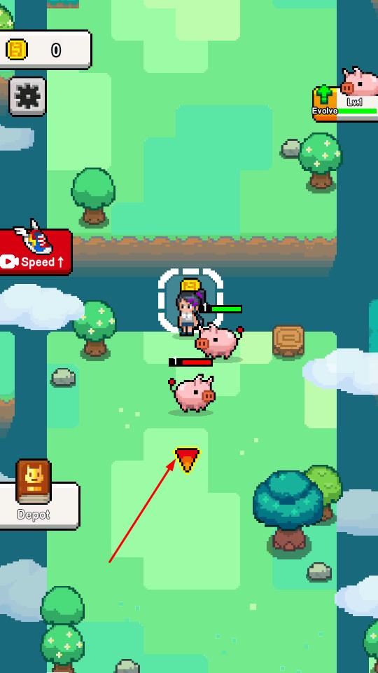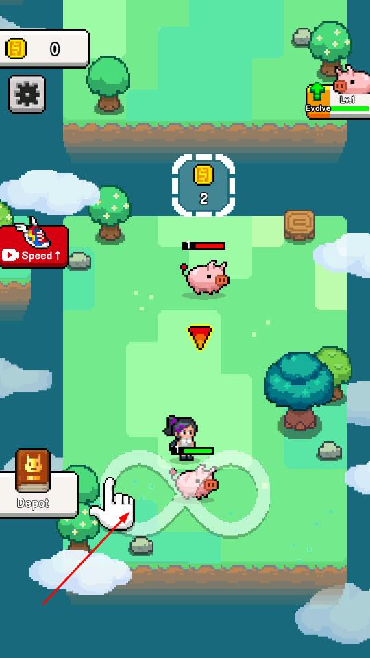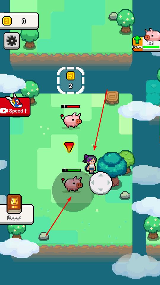 3、玩家按指示追击带有红血条的小猪,留意上方金币与进化提示,合理规划行动,提升游戏进度。