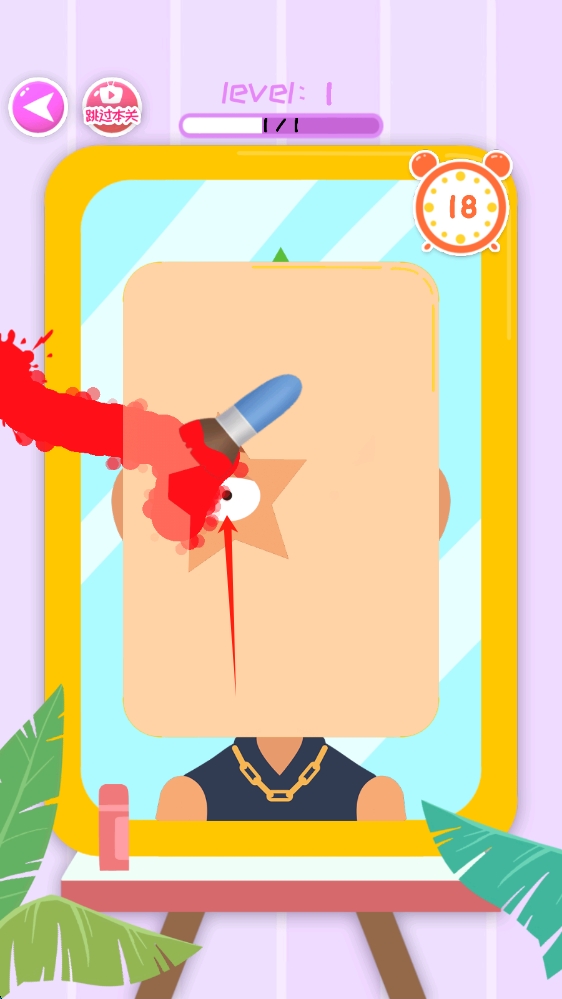 2、关卡1中,跟随箭头指引,操作工具,按要求为人物脸部进行变脸创作,按住画画。