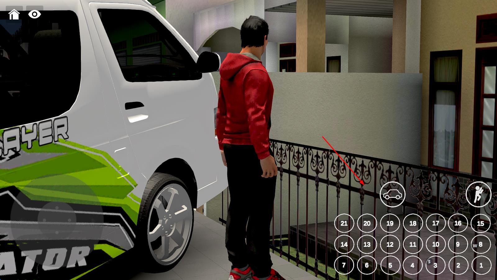 2、驾驶中点击摄像头切换视角,点击小人按钮下车,下车后点右下角数字做动作,靠近车辆点小车按钮即可再次上车。