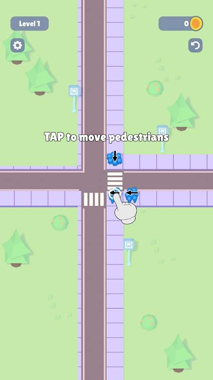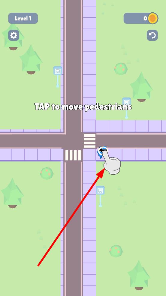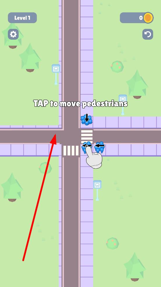 1、开启Level1,界面显示“TAP to move pedestrians”,此时点击道路区域,可让蓝色人群模块按点击方向移动。