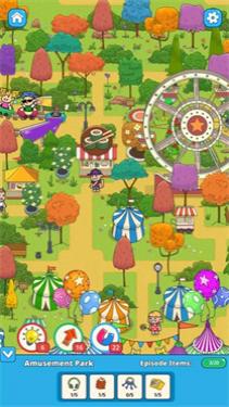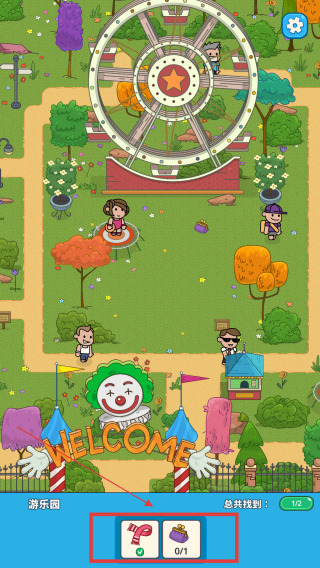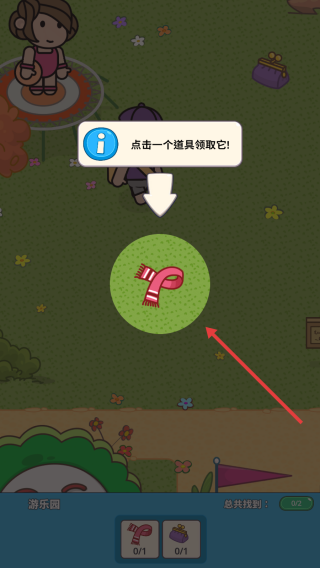 1、在游乐园场景,按提示点击绿色圈内的围巾道具,完成领取操作,道具会存入下方栏位。
