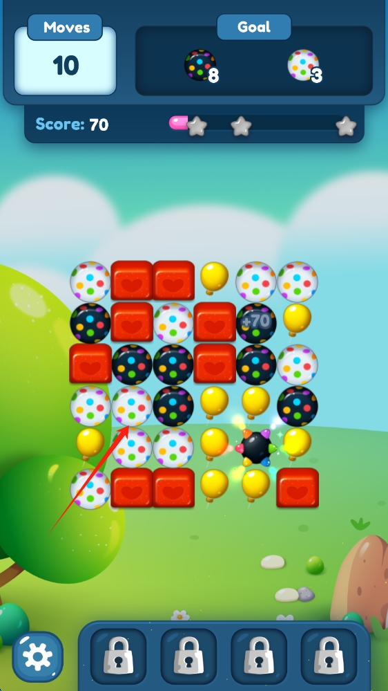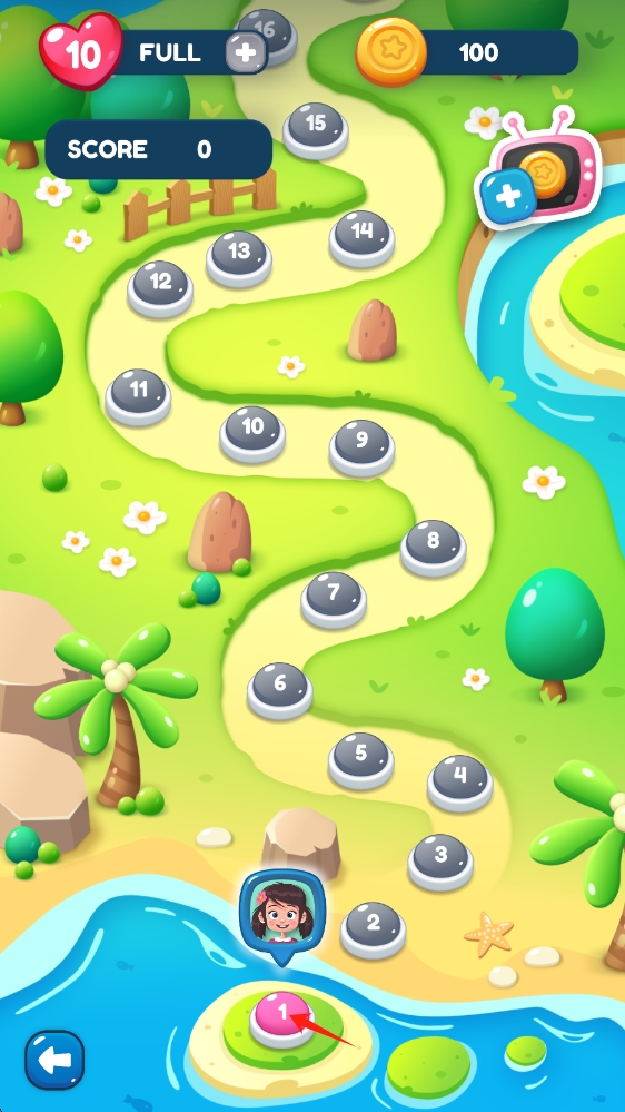2、关卡地图点击数字1,进入第一关,查看目标:消除8个波点方块、3个气球方块,点击选择关卡。