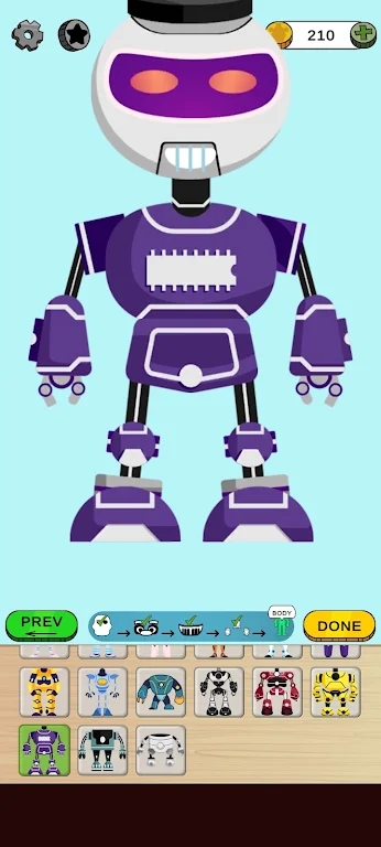 2、拼装组合:拖动选中零件到机器人主体对应位置,精准拼接头部、身体、四肢等,搭配金币解锁的新零件,打造独特外观,展现创作力。