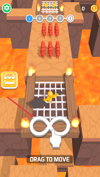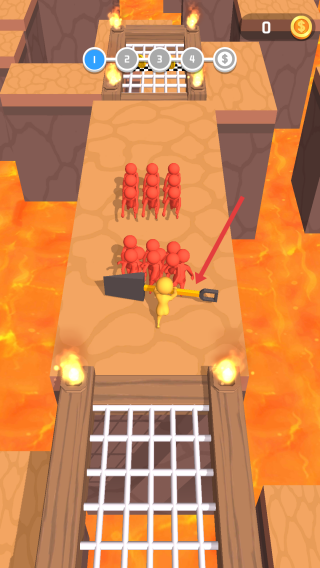 2、成功移动至敌人所在路径后,持续操作角色,借助手中武器,朝着红色敌人推进,逐个撞击他们,同时留意两侧火焰,保持移动节奏,突破敌人防线往关卡终点前进。