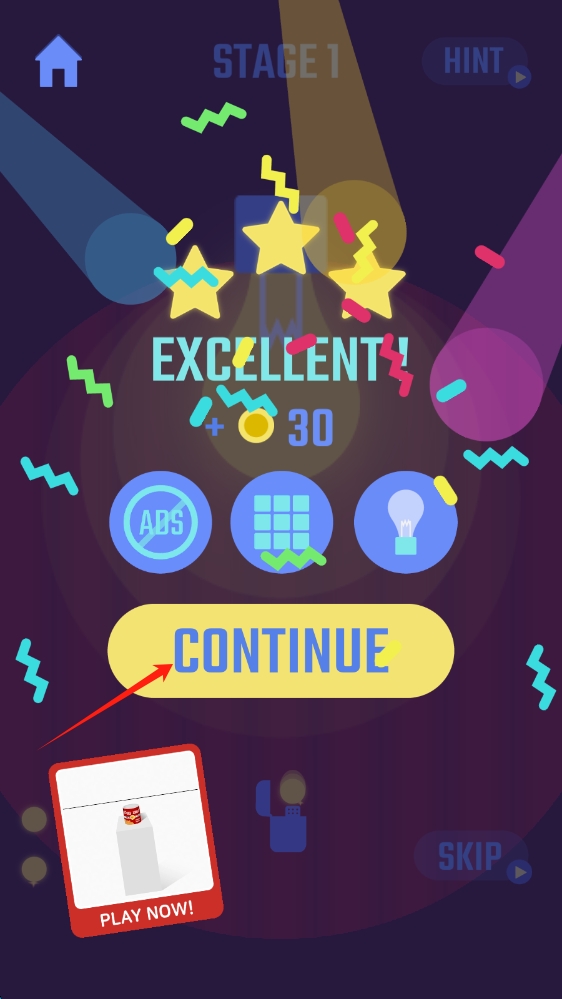3、成功通关后,点击CONTINUE,进入下一关,继续挑战更多点亮难题,点击继续游戏。