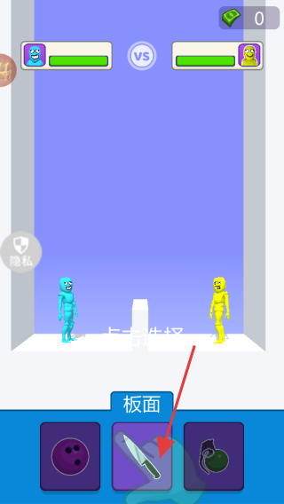 2、进入对战场景,根据对战形势和对手特点,从板面提供的刀等武器选项中选择合适武器,不同武器有不同攻击效果。