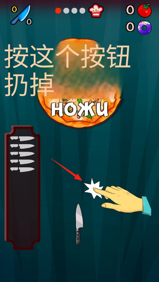 1、界面上有个按这个按钮扔掉的提示,看到手点的白色星星按钮,点它就能扔掉当前东西,可能是不满意的食材或刀具,玩的时候要是遇到不想用的道具,点这个按钮清掉。