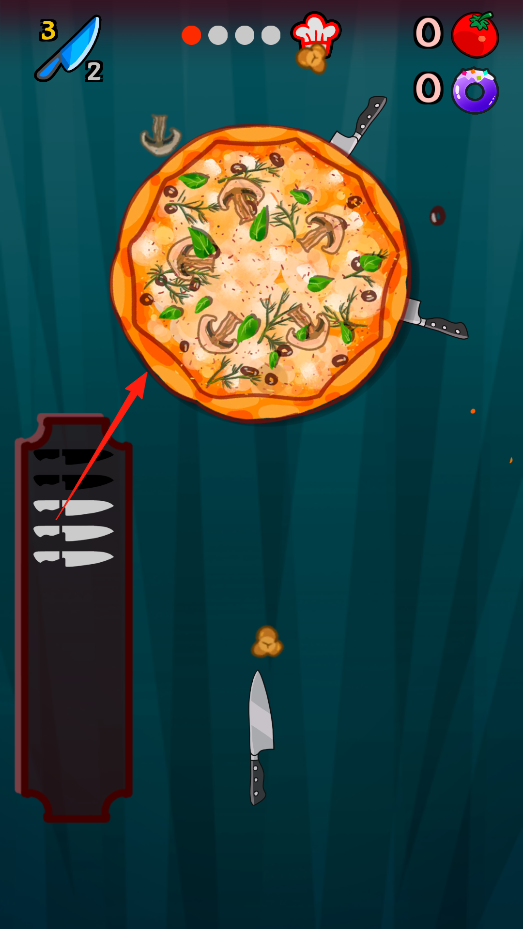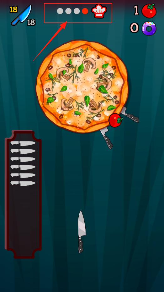 3、每加对食材切好披萨,进度条就会推进,旁边还有番茄甜甜圈计数,收集够食材、完成进度,就能解锁新关卡,玩的时候要盯着进度条,合理用食材。