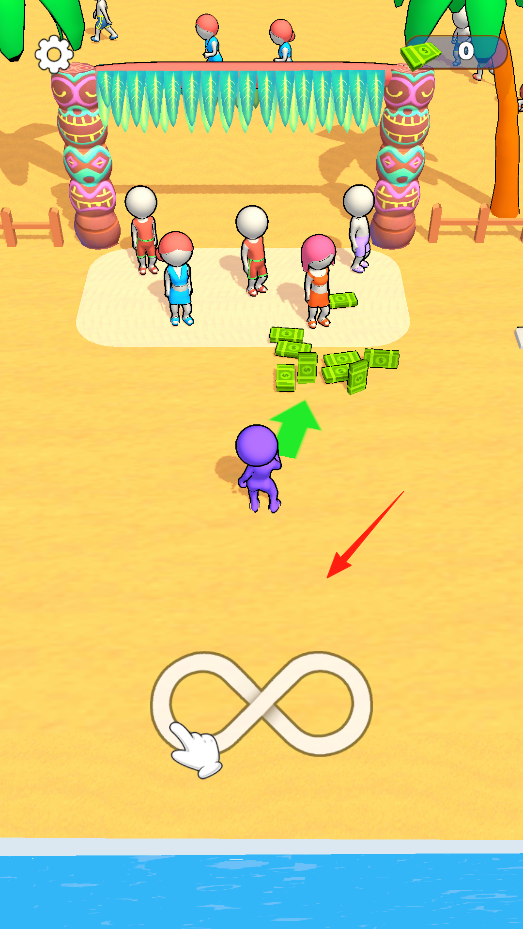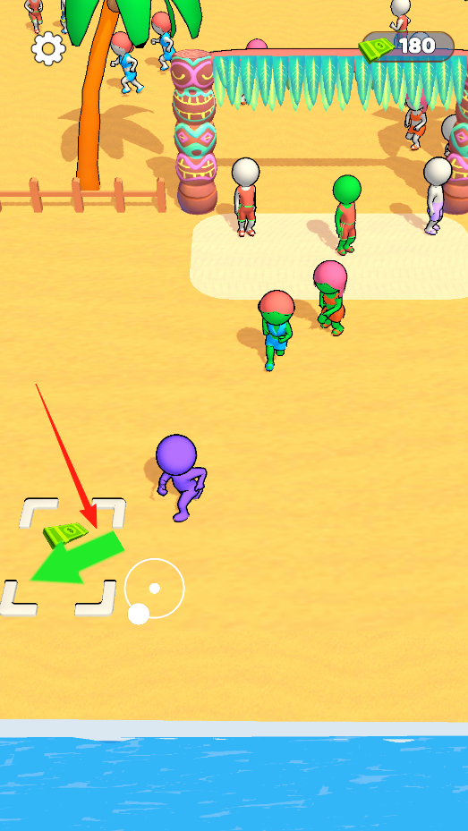 2、紫色小人在沙滩溜达,看到绿色箭头框住的钞票,跑过去收入囊中,每捡到钞票,右上角金额就涨,攒够钱能解锁新功能,比如买道具、升级技能,边捡钱边留意周围游客。