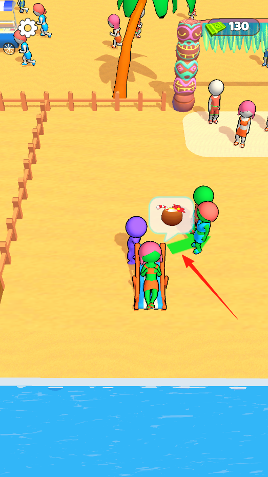3、紫色小人遇到躺椅上的游客,头顶冒出椰子饮品气泡,这是服务需求,得赶紧找椰子做饮品,端给游客,完成后能赚大钱,还能提升口碑,就像在沙滩开移动饮品店。