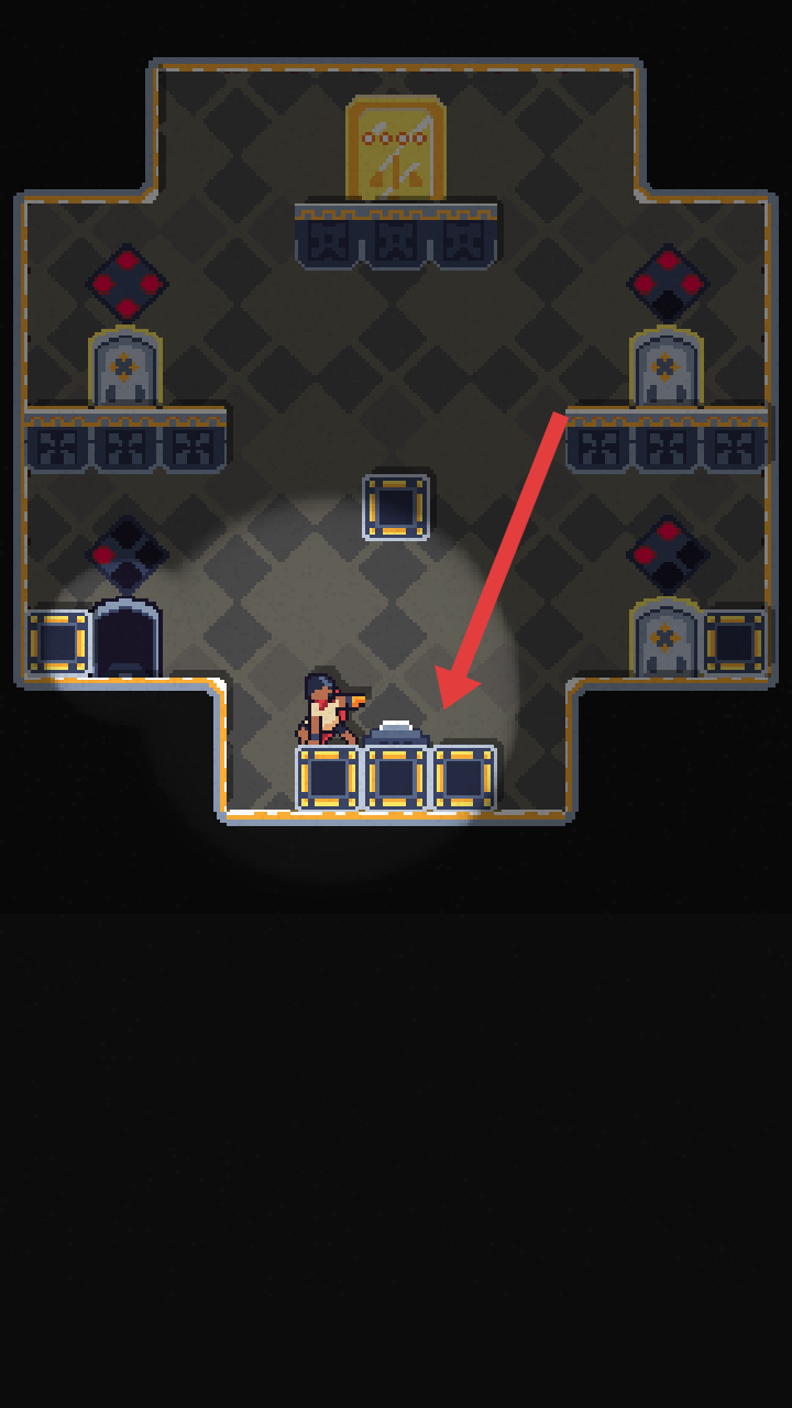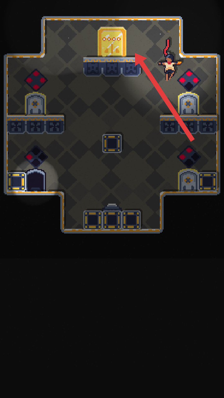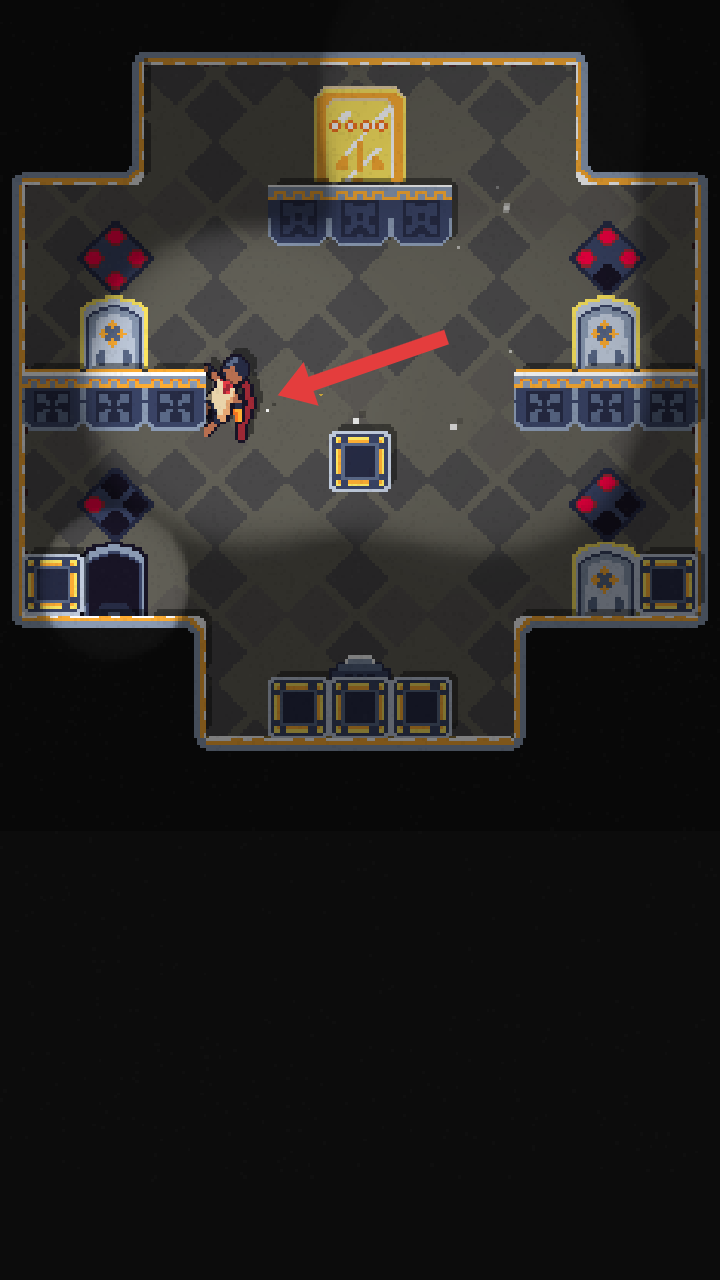 1、进入地宫场景后,操控角色靠近下方三排金色纹饰,同时留意四周对称分布的菱形机关与高台布局。