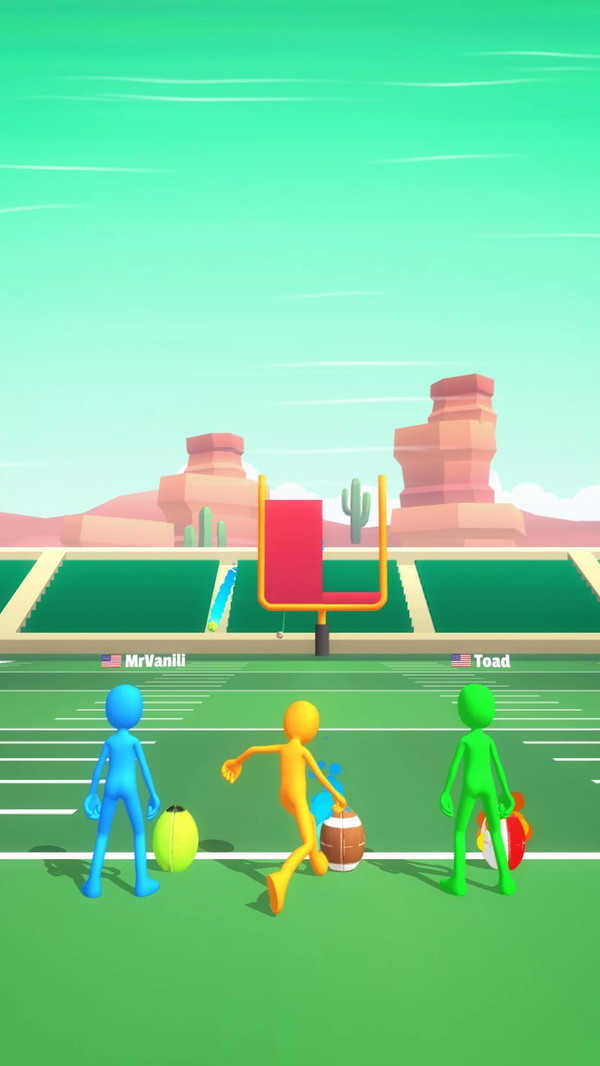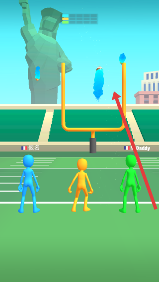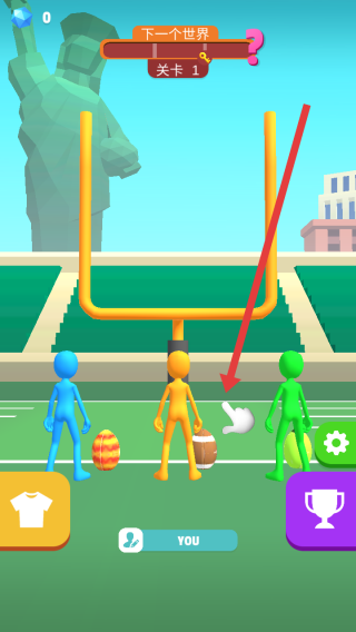 2、开始游玩时,需要滑动屏幕控制橙色角色抛出橄榄球,调整角度与力度,让球精准穿过球门区域。