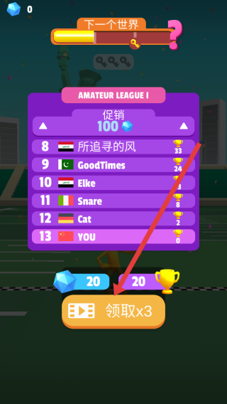 3、在比赛结束后,可以在排名界面点击领取x3按钮,观看视频获取对应奖励,助力后续赛事。