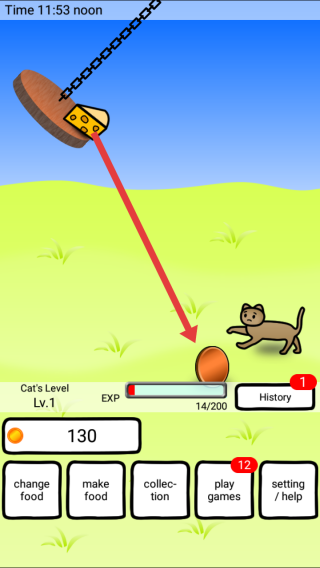 2、通过点击猫咪旁的硬币,让猫咪移动拾取,积累资源,可用于升级等操作,推动游戏发展。