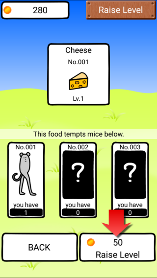 3、可以按照箭头提示,点击下方50-Raise-Level按钮,消耗50货币提升Cheese等级,增强其吸引老鼠的效果。