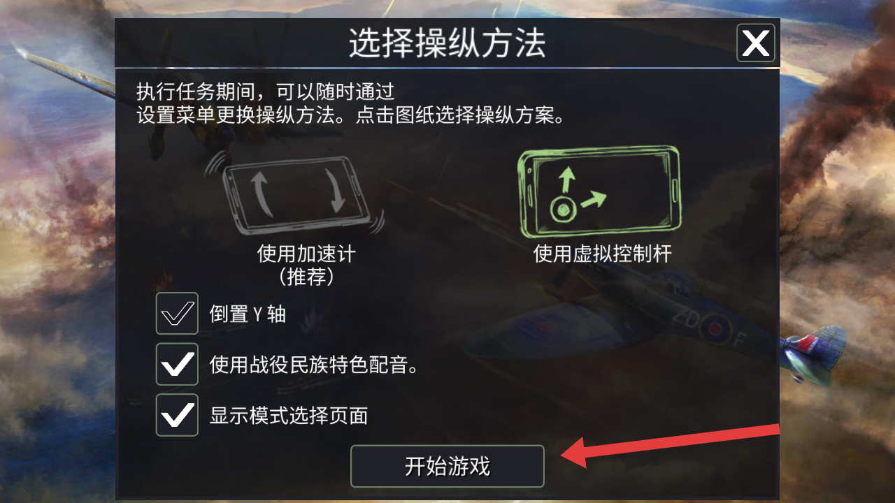 1、在操控设置界面,选定系统推荐使用加速计等操控方案后,点击开始游戏,正式进入飞行战斗任务。