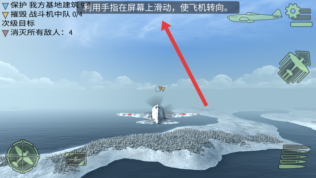 2、在游戏中需要按照提示通过手指在屏幕滑动,控制飞机转向,灵活调整飞行方向追踪目标。