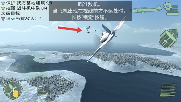 3、当敌机出现在视线前方近处时,需要长按锁定的按钮瞄准敌机,接着点击右下角攻击按钮进行攻击。