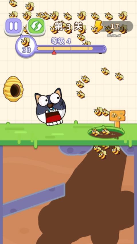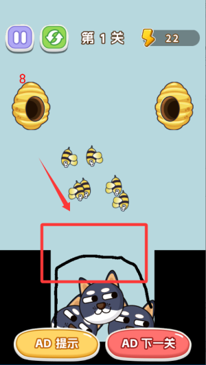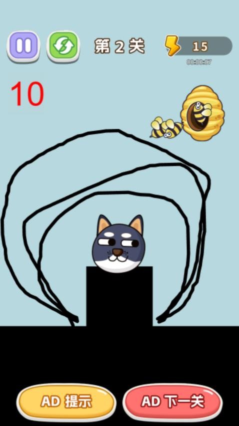 1、开局先观察蜂窝与狗狗的位置关系,找到最佳的画线角度和路径,快速画出防护罩阻挡蜜蜂接近,确保狗狗不会受到伤害。