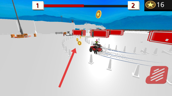2、进入比赛中,按照沿箭头方向行驶,避开障碍,收集金币,保持车辆稳定,争取领先对手。