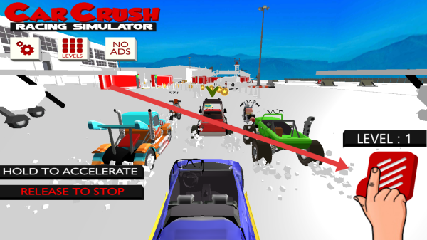 1、在Car-Crush-Racing-Simulator开始界面,长按红色按钮加速,控制车辆出发,开启Level-1竞速挑战。