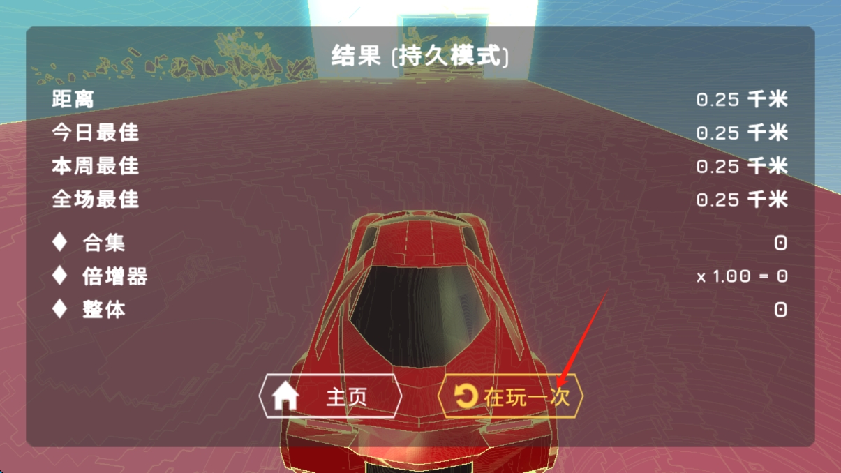 3、结算页点击再玩一次,重新挑战,突破0.25千米的行驶距离纪录,点击重开游戏。