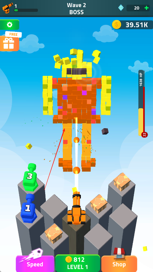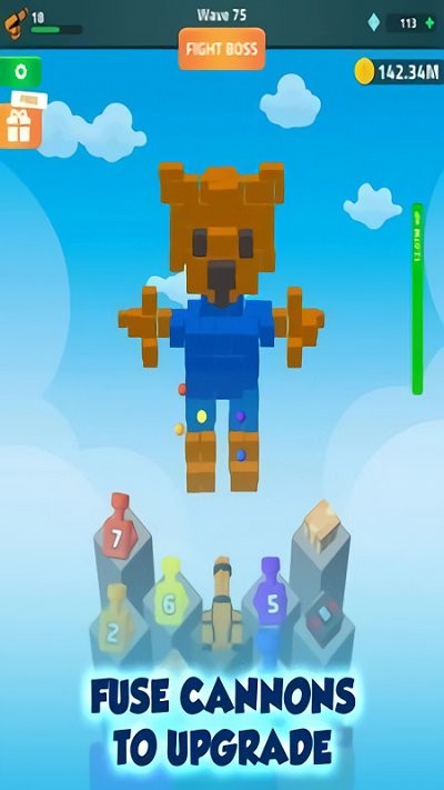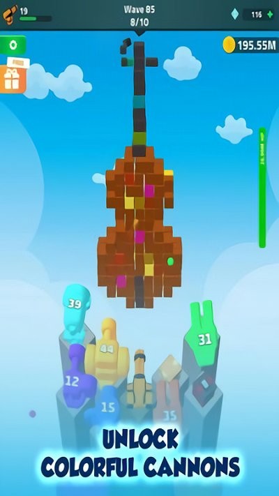 2、需观察方块的排列和颜色分布,调整大炮角度瞄准同色调方块,通过连续消除积累能量,合成攻击力更高的大炮,应对越来越复杂的方块布局。