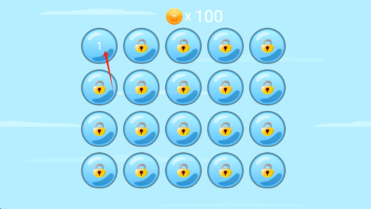 2、在关卡选择页,点击标1的蓝色圆球,进入第一关,开启基础挑战,积累金币,点击选择关卡。