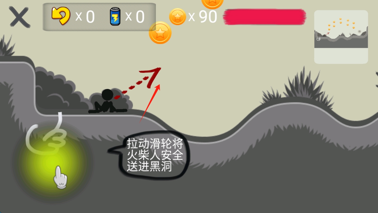 3、游戏中拉动滑轮,让火柴人沿轨迹移动,避开障碍,安全送进黑洞,完成关卡,按住瞄准。
