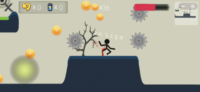 1、操控火柴人前进:通过手指操作踢动火柴人,让其在关卡中前进,躲避齿轮、陷阱等障碍,同时收集金币,利用小地图规划路线提升效率。