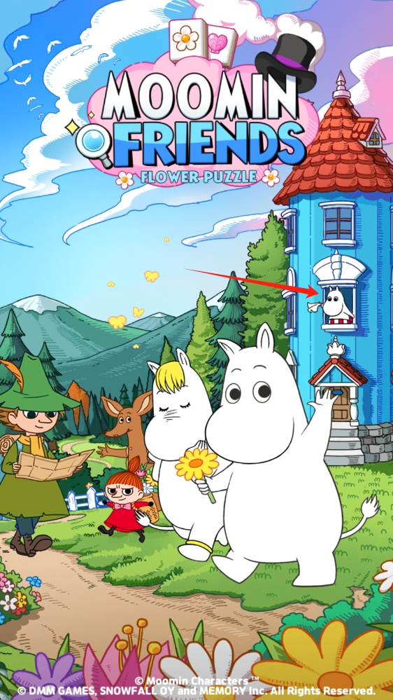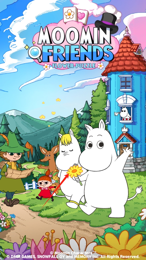 1、进入MOOMIN-FRIENDS-FLOWER-PUZZLE,欣赏角色与场景,准备开启花朵谜题冒险,点击开始游戏。