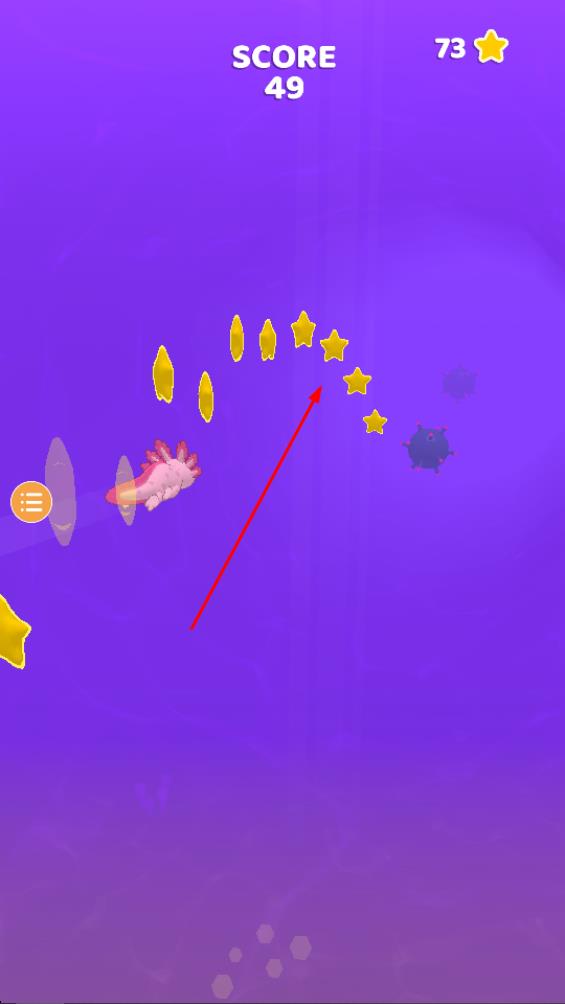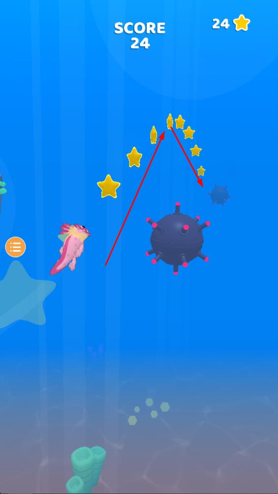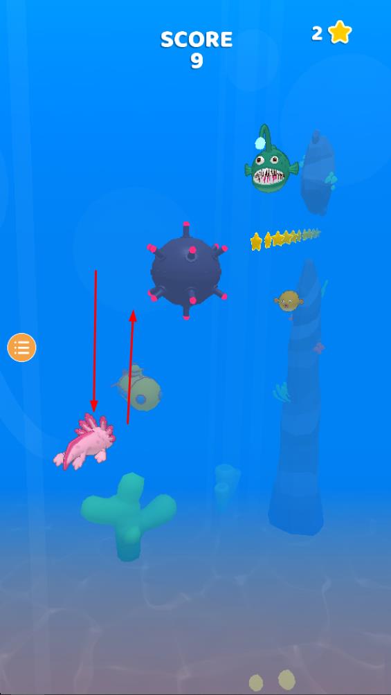 1、在海底世界场景操控粉色蝾螈,通过滑动屏幕调整移动方向,躲避障碍物,收集星星,积累分数。
