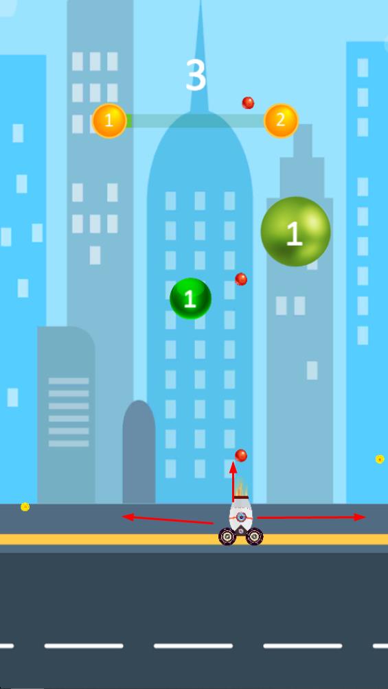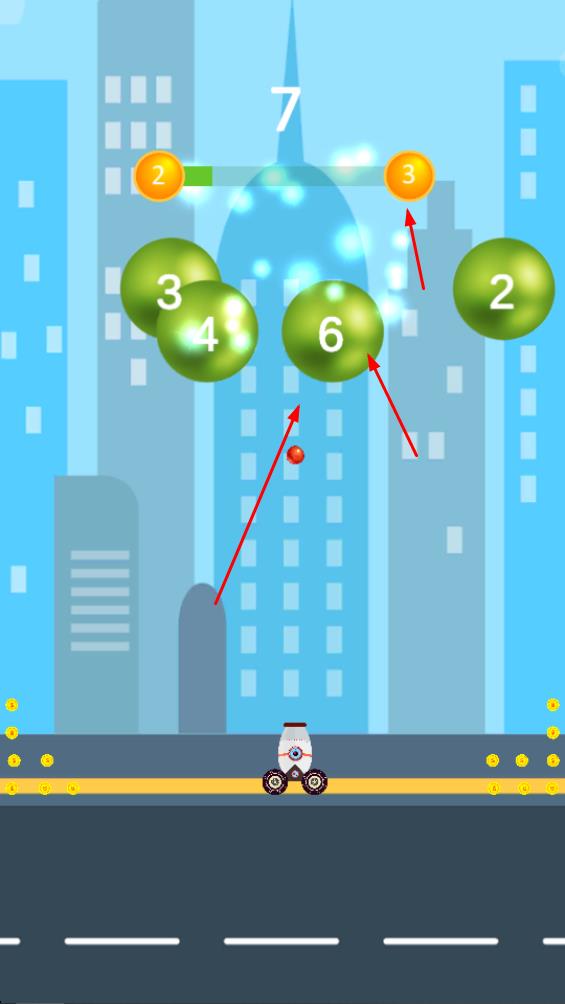 1、在城市场景中,使用炮弹发射器,瞄准绿色泡泡发射炮弹,击碎泡泡,获取分数。