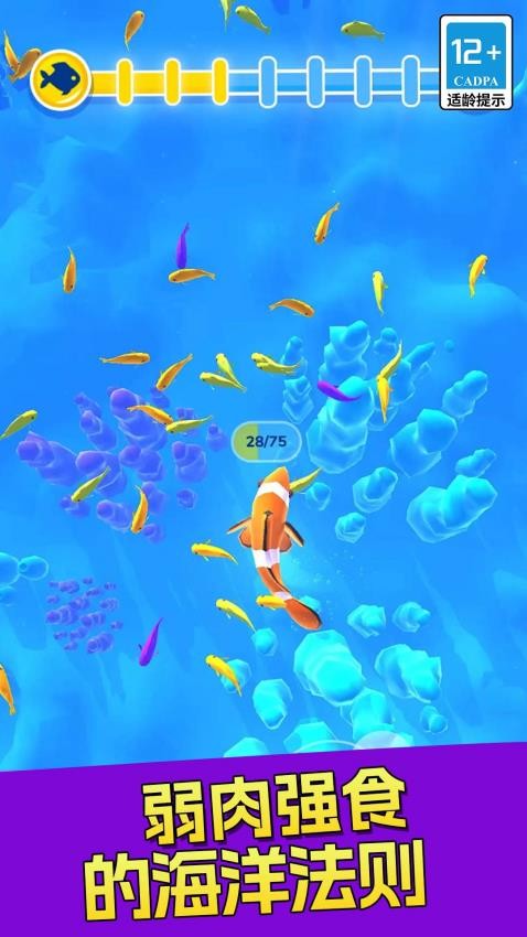 2、在海洋中灵活游动,观察猎物分布与强敌位置,合理规划行动路线,避免硬拼同时保证稳定获取食物资源。