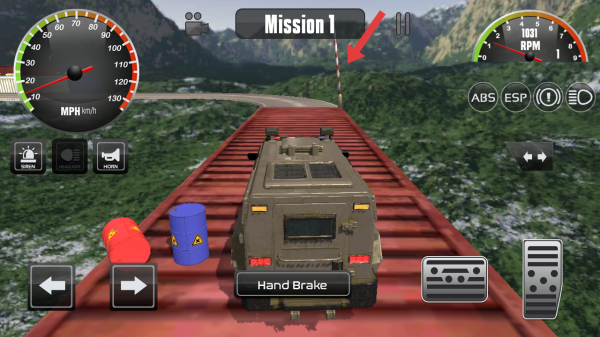 2、操控虚拟方向键、手刹等按键,注意避开油桶、危险桶障碍,沿红色桥面驶向远处红色栏杆处。