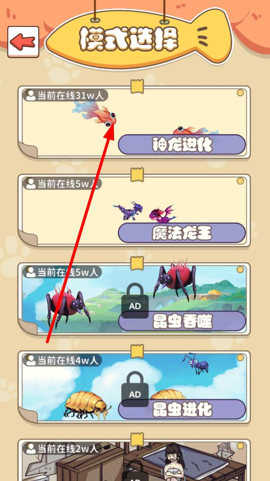 1、在模式选择界面点击想玩的玩法,如神龙进化,进入对应场景,拖动/点击角色,让其自动吞噬场景内可食用目标小蝌蚪,积累经验升级。