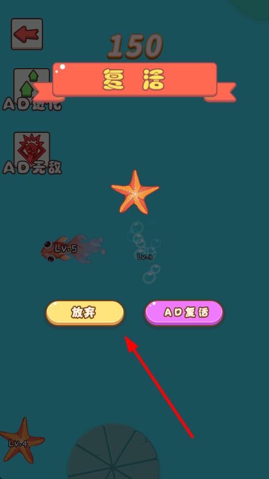 3、若角色被被高等级生物吞噬的话,会弹出“复活”界面,可选择“放弃”重新开局,或“AD复活”观看广告复活继续战斗,成功通关或吞噬达标则解锁新玩法。