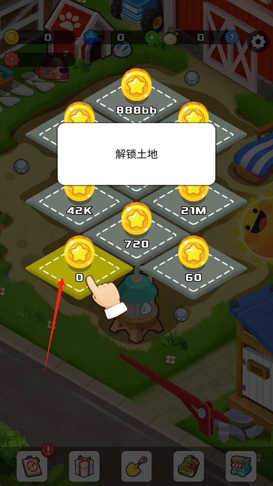 1、点击金币标识,消耗对应金币,解锁新土地,扩大农场种植区域,点击解锁区域。