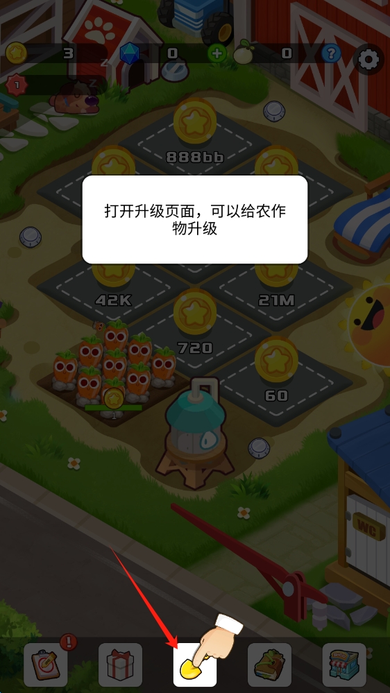 2、点击底部铲子图标,进入升级页面,消耗资源给农作物升级,提升收益,点击使用道具。