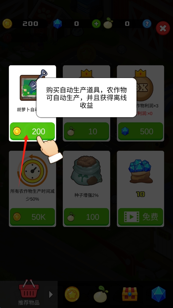 3、在道具页,点击200金币的胡萝卜自动生产道具,开启自动生产与离线收益,点击购买物品。