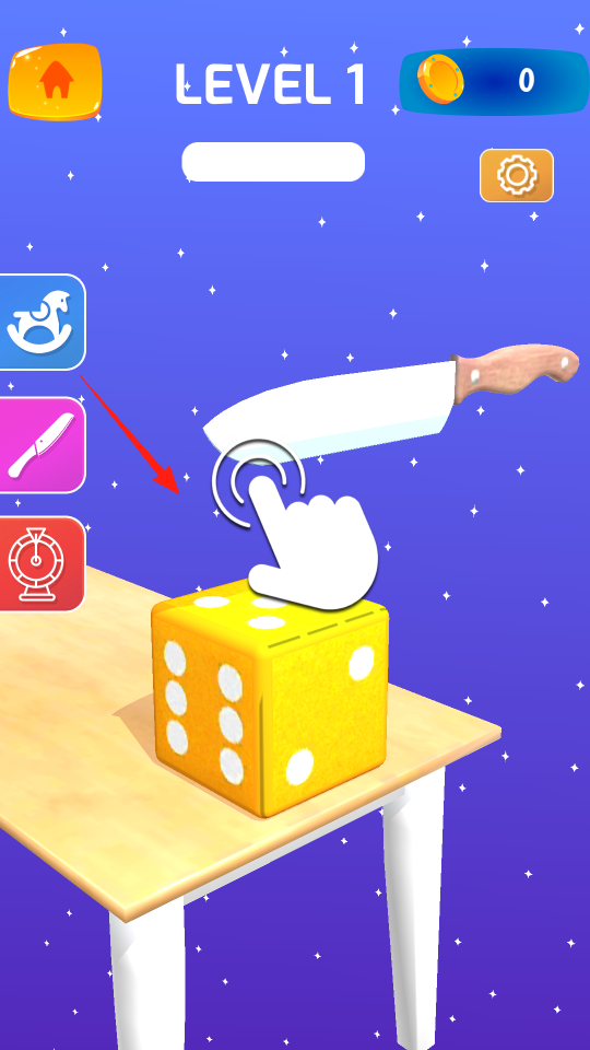 2、第一关出现黄色骰子,按提示滑动屏幕,控制刀具切骰子,要精准操作,让刀具沿着轨迹把骰子切开,考验手速和节奏,跟着指引,让刀具稳稳切过骰子。
