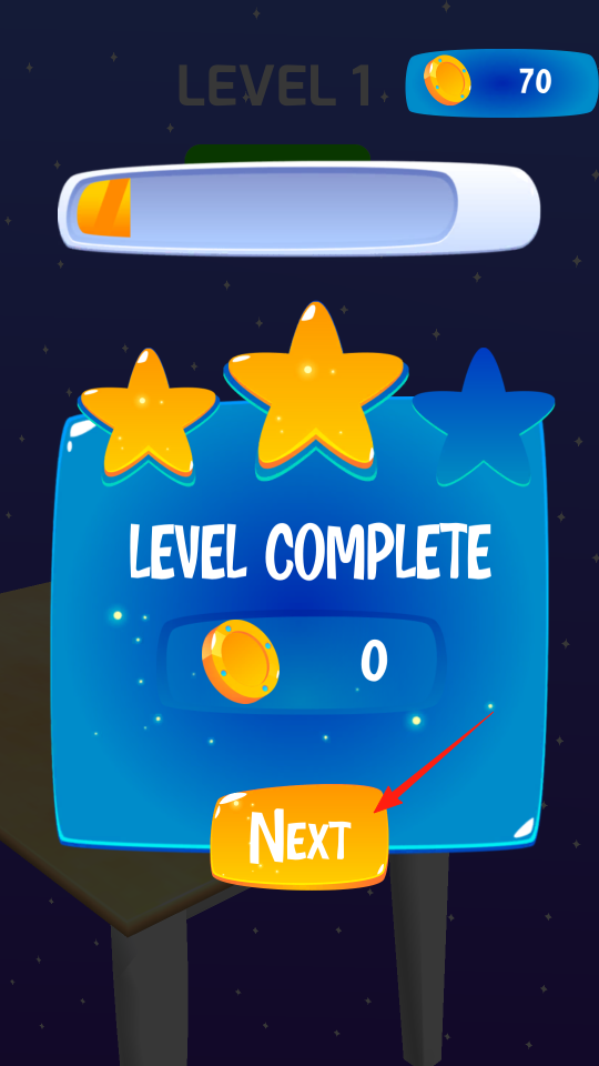 3、成功通关第一关,弹出LEVEL COMPLETE界面,还有星星评价,点Next进入下一关,挑战更难的切割物品,解锁新道具,一关关推进,每通关就解锁新内容。