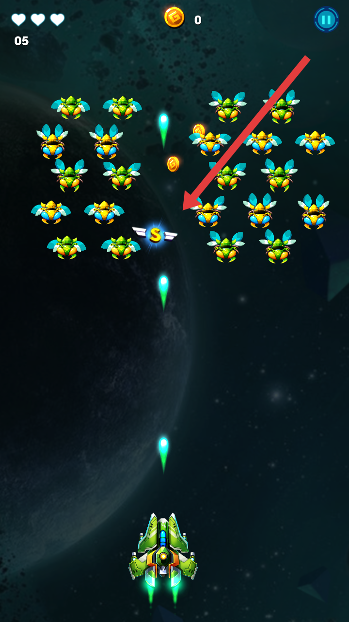 1、操控底部绿色战机,发射子弹消灭上方蜂形敌人,同时拾取金色金币积累资源,留意左上角爱心血量,躲避敌方攻击。